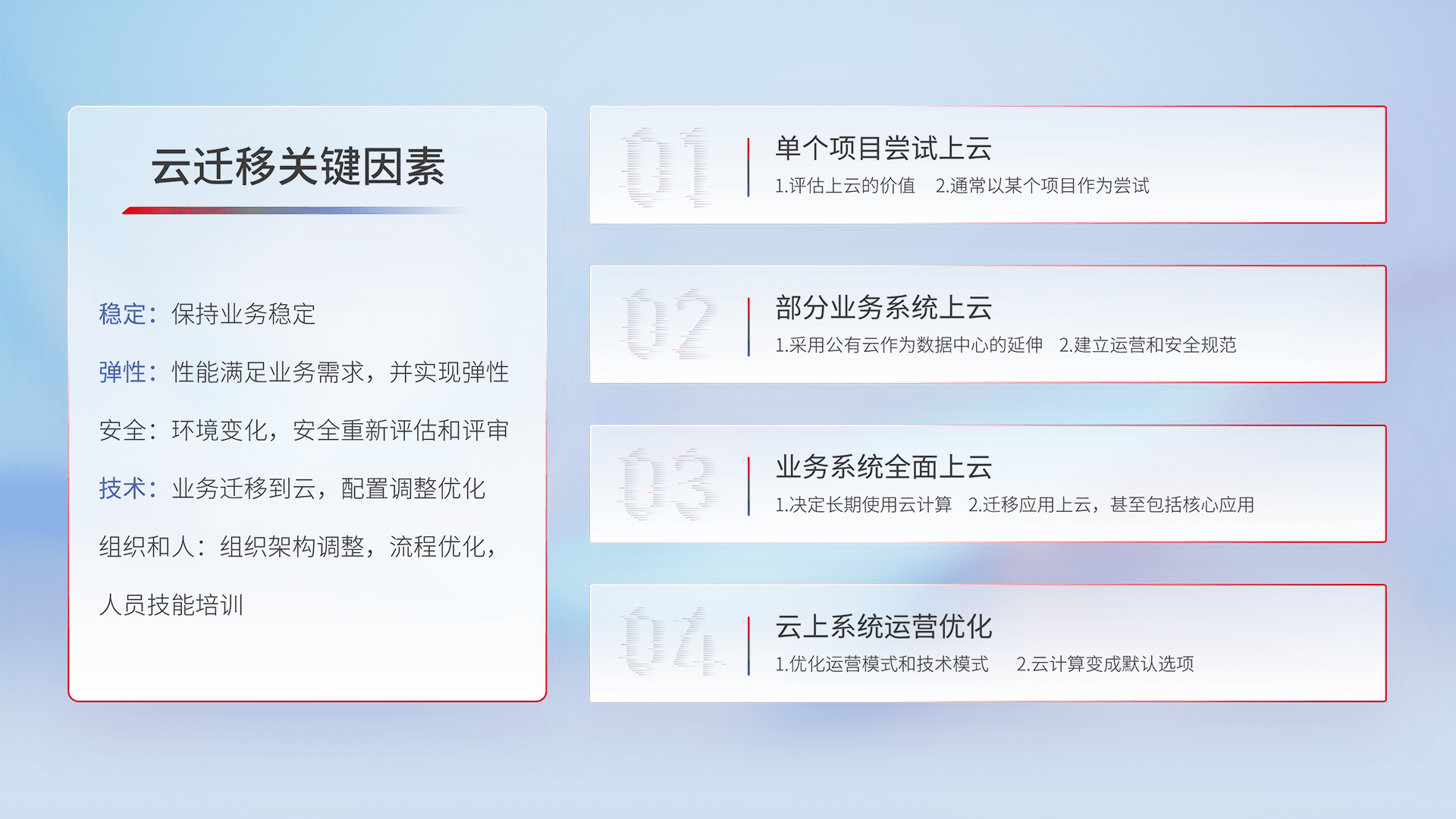结合实际业务,,,从规划设计、、、、云平台选型、、、、云原生改造、、、数据迁移、、、、集成交付,,,迁移全过程为客户识别最佳上云路径,,,做好风险识别管理,,,设计网络架构、、、身份权限、、安全审计合规、、、操作审计、、、日志审计、、、监控告警策略、、、、多站点容灾设计等,,,对云上基础设施进行整体规划,,,,提升IT治理水平,,,,以满足弹性、、、、高可用、、、、高性能的需求。。。